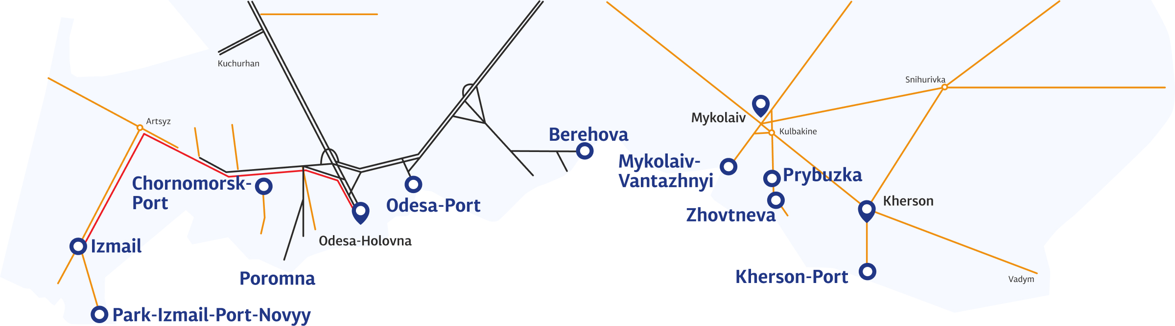 The branch "Operator of Port Stations" unites 9 railway stations located in the largest ports of Ukraine: Odessa, Izmail, Yuzhne, Chornomorsk and Mykolaiv.